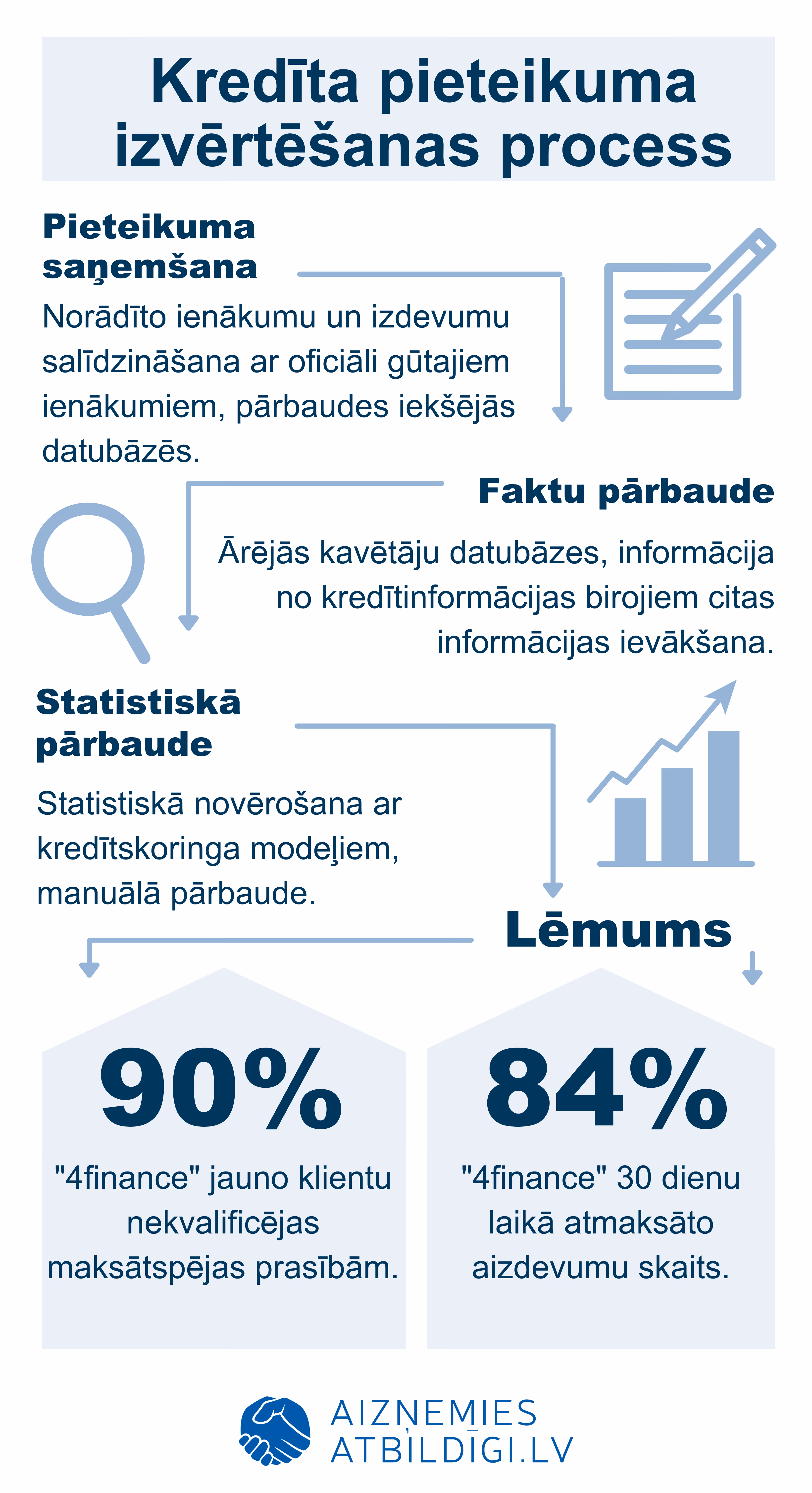 Lai pieteiktos distances kredītam, klientam ir jāaizpilda pieteikuma anketa, sniedzot pamatinformāciju par sevi – vārds, uzvārds, personas kods, e-pasta adrese, tālruņa numurs, kā arī jānorāda oficiālo ienākumu un potenciālo izdevumu apmērs. Neatkarīgi no aizdevuma summas nebanku kredītdevēji nepaļaujas tikai uz patērētāja sniegto informāciju, bet izmanto daudzpakāpju maksātspējas pārbaudi. Uzņēmumu klientu maksātspējas pārbaudes sistēmas vērtē tūkstošiem dažādu kritēriju, kuri ļauj ne tikai ar augstu precizitāti noteikt klienta šī brīža finansiālo stāvokli, bet arī prognozēt, vai un kā tas varētu mainīties kredīta atmaksas laikā. Katra, no pirmā acu uzmetiena nenozīmīga detaļa, kredīta pieteikuma aizpildes procesā kredītdevējam ir nozīmīga klienta kredītreitinga un kopējā “digitālā nospieduma” veidošanā.